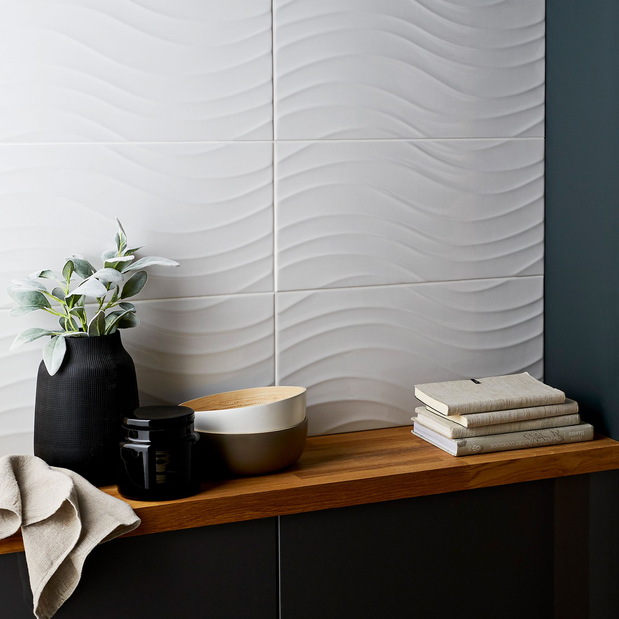 The surface of these large bumpy white wall tiles is gently undulated and the gloss finish combine to make a clean look.